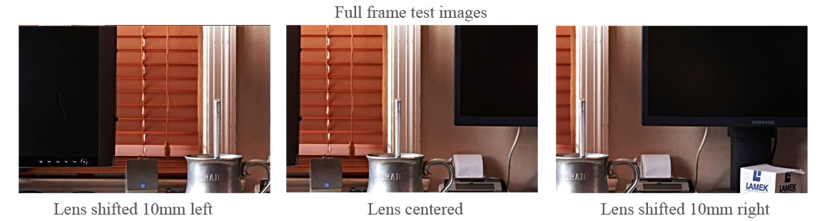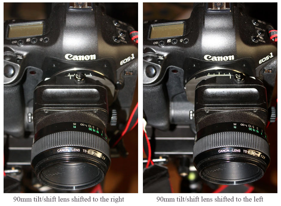 The 90mm Ts-e lens ( http://www.usa.canon.com/consumer/controller?act=ModelInfoAct&fcategoryid=156&modelid=7329#ModelDetailAct ) was chosen for two reasons, it allow for shifting the lens side to side by 10mm in each direction and it is highly corrected for distortion so no transforming of barrel or pincushion is needed, The actual camera never moved during the test. Only the lens was moved a total of 20mm from side to side.
